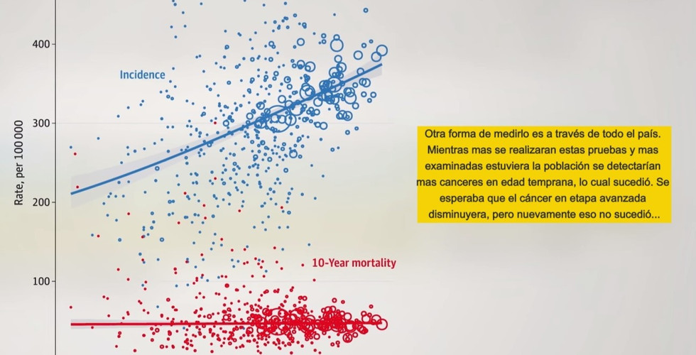 Otra forma de analizar el diagnóstico de cáncer, es comparando las tasas de mamografías en todo el país: cuantas más mamografías se realicen, más cánceres en etapa temprana se detectarán y la enfermedad metastásica avanzada debería disminuir, nuevamente esto no ha ocurrido. Vemos como las mamografías detectan muchos de los cánceres incipientes, pero no hay disminución en la detección de cánceres graves y la muerte por cáncer de mama no parece cambiar. Todo esto sugiere un sobrediagnóstico, es decir, cáncer detectado en una mamografía el cual nunca habría progresado o causado algún daño, si nunca se hubiera detectado, o incluso habría desaparecido por sí solo.
