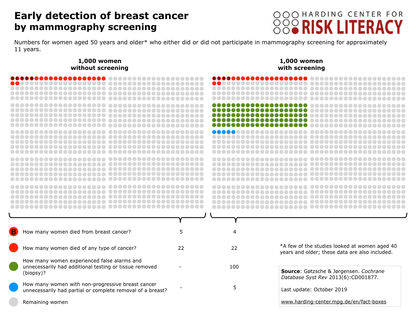 En un estudio se usaron mil mujeres, se escogieron de forma aleatorias y no se le hicieron mamografías, a otro grupo también aleatorias, si se les realizaron mamografías. Después de una década, al grupo que no se realizaron mamografías, aproximadamente 5 de las 1,000 murieron de cáncer de mama, lo que significa que aun sin pruebas de detección temprana las probabilidades de morir por cáncer de mama a las mujeres mayores de 50 años son menores del 1%. Pero por el otro lado, al grupo donde sí se realizaron mamografías con regularidad, en lugar de 5, solo 4 de cada 1,000 murieron de cáncer de mama y aunque la cantidad de mujeres que morirán en general parece ser la misma, las mamografías no salvan vidas en general. Pero quizás estos estudios no han tenido el poder estadístico suficiente para captar el beneficio de supervivencia general.